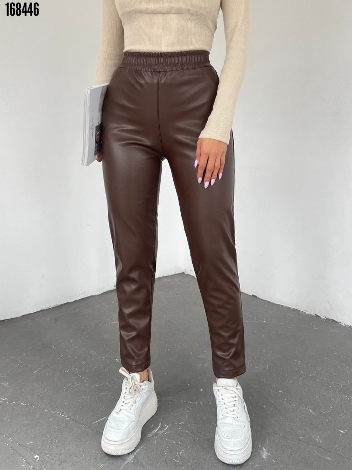 Kahverengi deri, midi boy, regular fit kadın cigarette pantolon, kemerli bel detayına sahip. Günlük sokak stiline uygun. Ürün Açıklaması Beli Lastikli Deri Pantolon Siyah Modelin Ölçüleri: Boy:165, Kilo:55, Göğüs:90, Bel:72, Kalça: 100 Modelin üzerindeki ürün M/38 bedendir. Ürün ID 168447