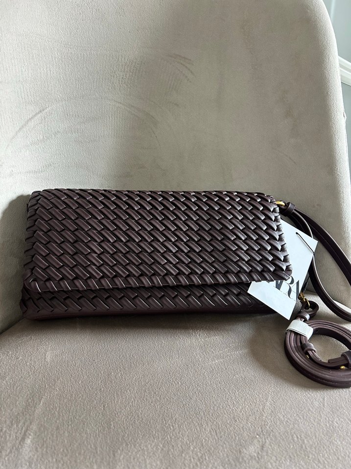 Kahverengi deri, kemerli tasarıma sahip, dokuma desenli clutch çanta. Günlük kullanım için minimalist ve sokak modasına uygun.