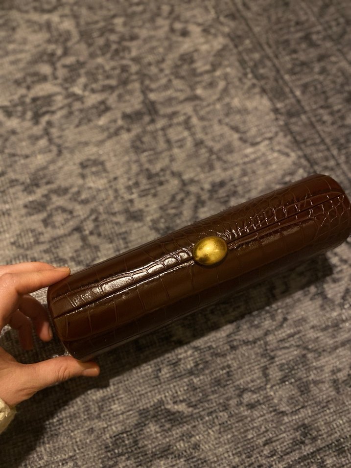 Kahverengi deri kadın clutch çanta, tokalı kapama ve yılan derisi desenine sahip, klasik zarafeti Parisli karşı kültür tarzıyla birleştirir. Bir kere düğünde takıldı