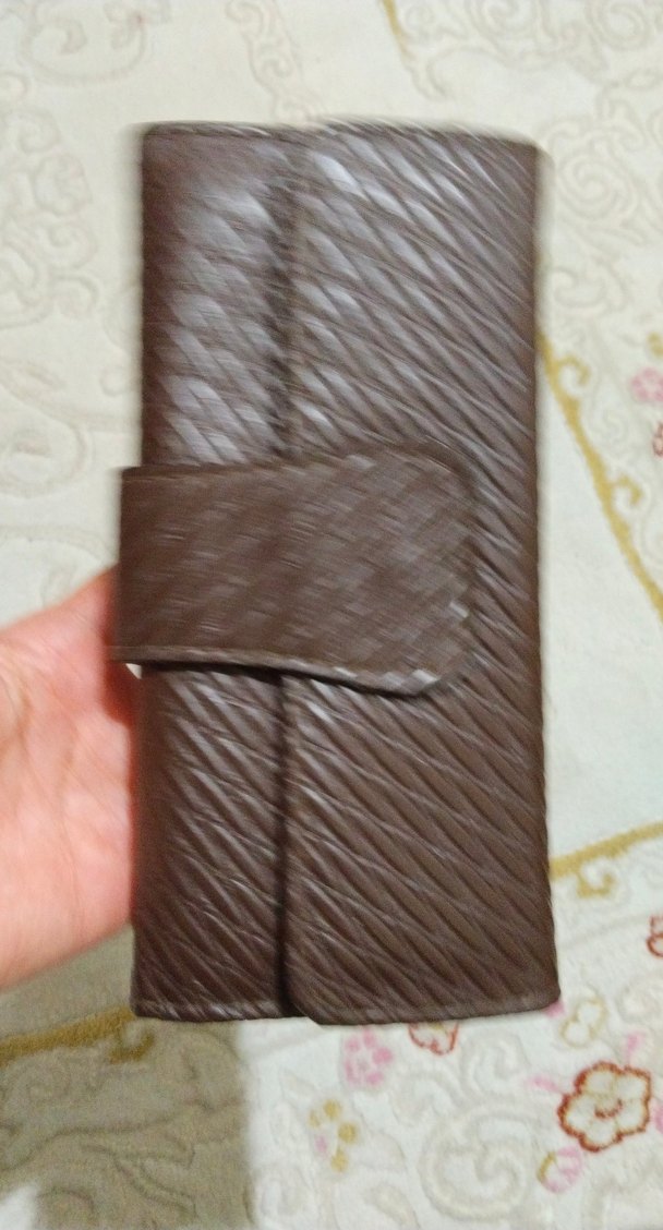 Koyu kahverengi deri kadın cüzdanı, pileli tasarıma ve sade tokaya sahiptir. Günlük kullanıma uygundur, geleneksel ve minimalist tarzda.