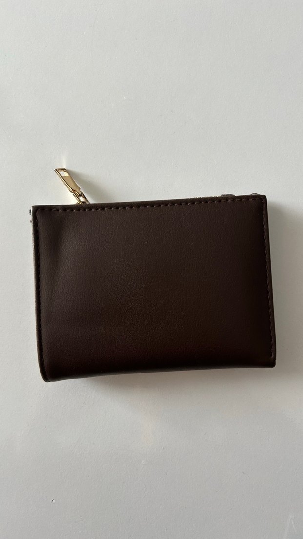 Koyu kahverengi deri kadın cüzdanı, fermuarlı kapama ve minimalist desen içermektedir. Günlük kullanım için uygundur.