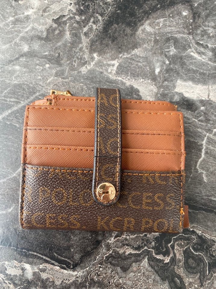 Kahverengi deri, baskılı desenli ve tokalı kadın cüzdanı, günlük kullanım için uygun, sokak stiliyle uyumlu.