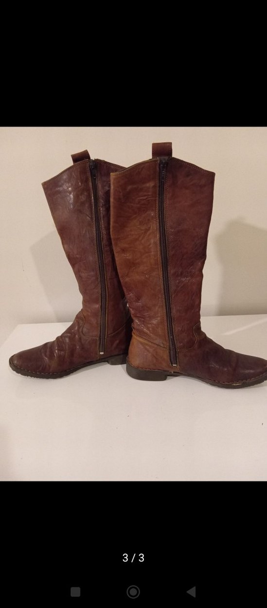 Kahverengi deri, diz boyu, tokalı ve dolgu topuklu kadın botları. Yan fermuarları kolay giyim sağlar, vintage bohem tarzda, desensiz ve koyu renkte.