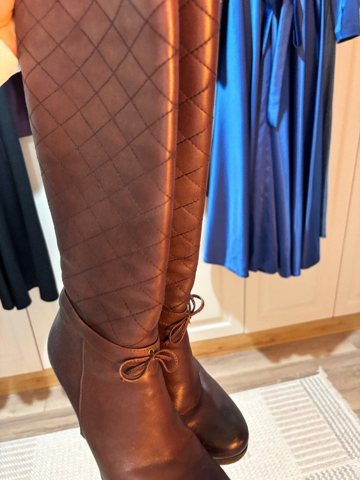 Kahverengi Deri Kadın Diz Boyu Çizme