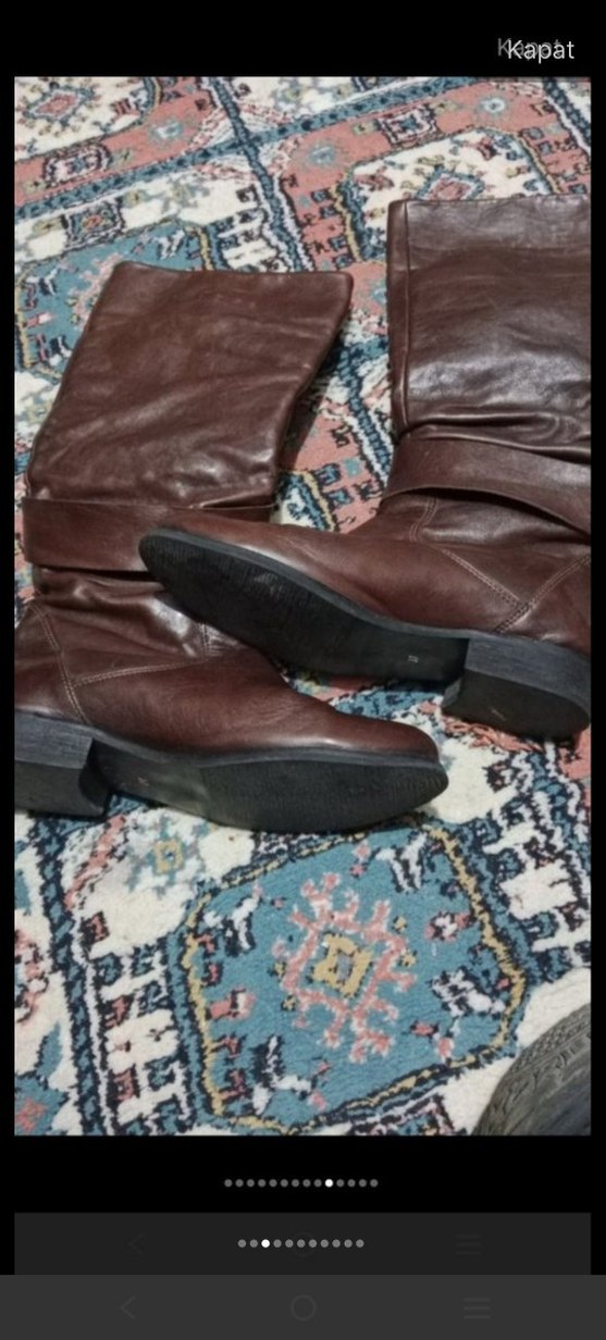 Kahverengi deri dizüstü botlar, dolgu topuklu ve tokalı detaylıdır. Rahat ve retro tarzıyla günlük kullanım için uygundur.