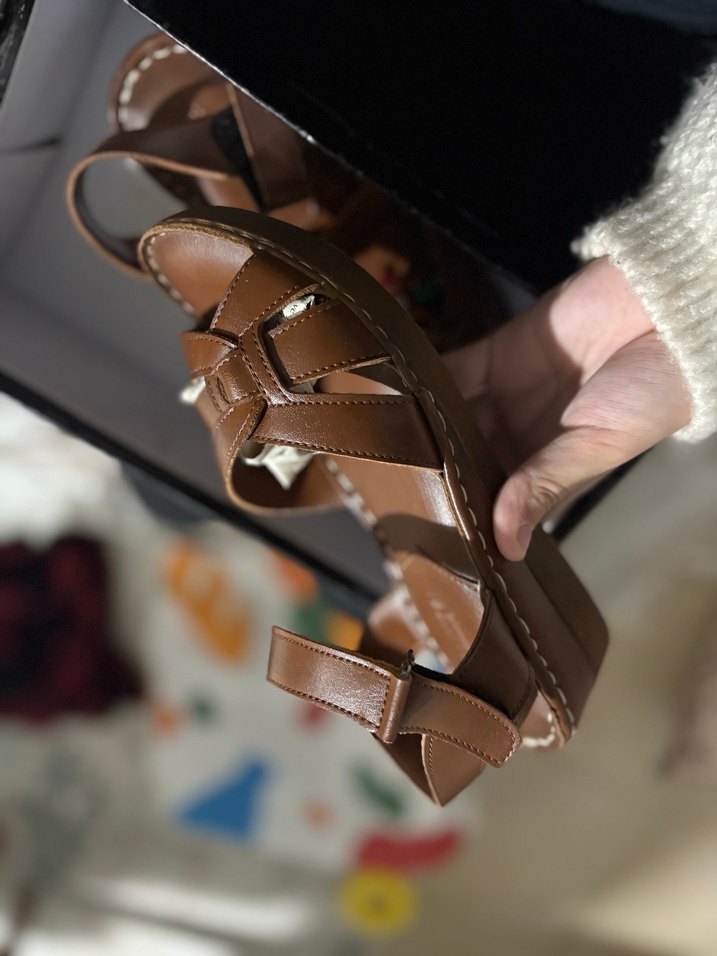 Kahverengi deri kadın sandalet, dolgu topuk ve tokalı kayışa sahiptir, sade ve günlük kullanım için uygundur. ortopedik