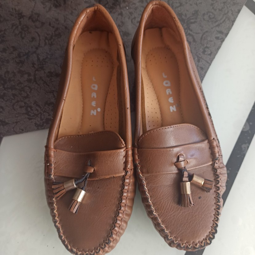 Kahverengi deri kadın dolgu topuklu ayakkabılar, tokalı detay ve parlak yüzeyle klasik tarzda, günlük kullanıma uygun.