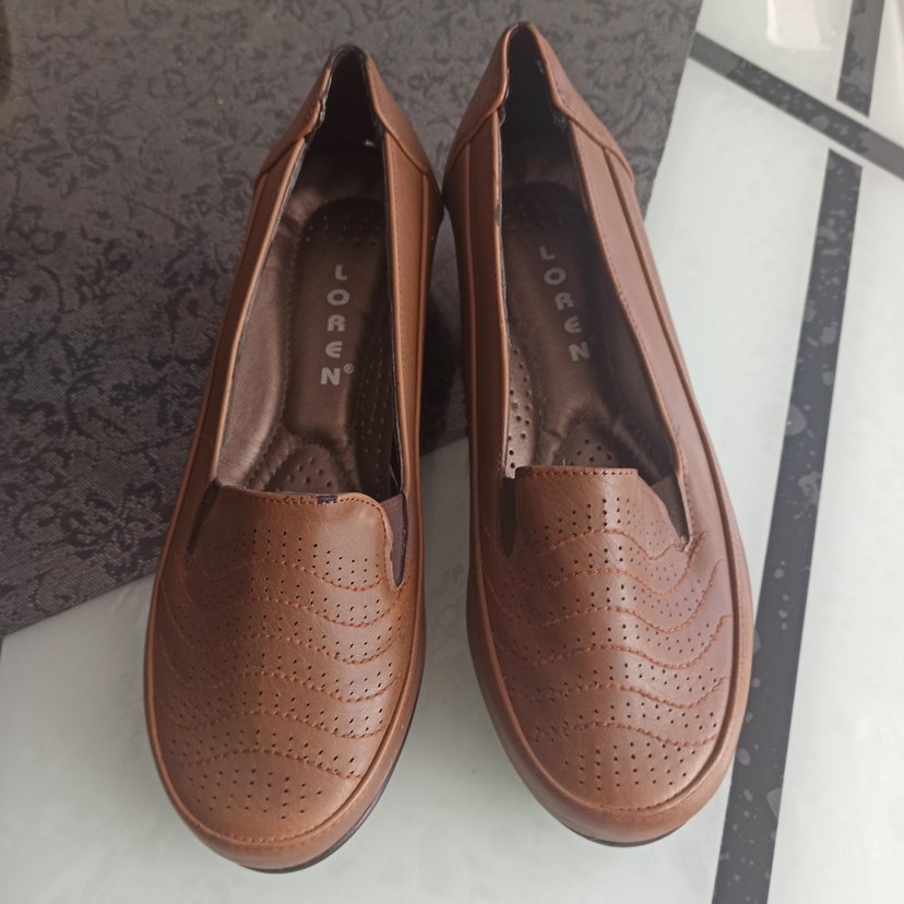 Kahverengi deri kadın babetler, dolgu topuklu ve tokalı tasarıma sahiptir. Parlak yüzeyli ve delikli desenlidir. Günlük kullanım için uygundur.