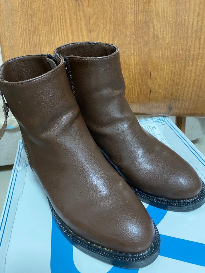Kahverengi deri kadın botlar, dolgu topuklu ve tokalı detaylı, düz yüzeyli ve modern tarzda, rahat kullanım için uygundur.
