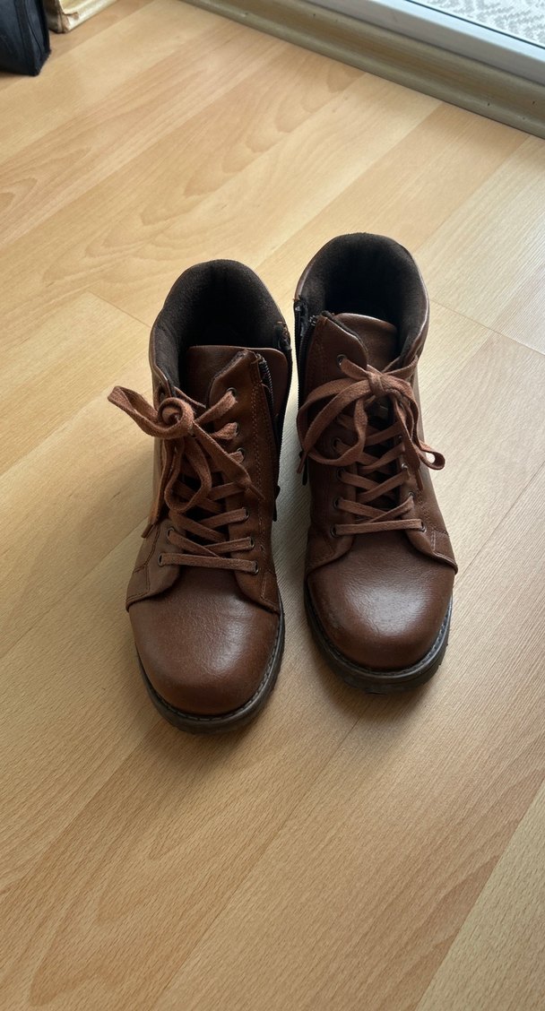 Kahverengi deri kadın botları, dolgu topuklu ve tokalı detaylara sahip. Koyu renk ve desensiz. Çok az kullanıldı.