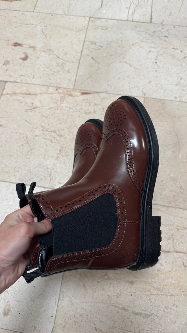 Koyu kahverengi deri kadın botlar, dolgu topuk ve tokalı detaylara sahip, günlük sokak stiline uygun.