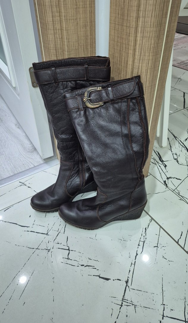 Kahverengi Deri Kadın Dolgu Topuklu Çizme
