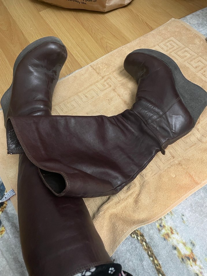Kahverengi deri malzemeden yapılmış, dolgu topuklu ve tokalı detaylı kadın diz boyu botları. Günlük kullanım için rahat ve şık bir tasarım sunar. 39 numara iade kabul etmiyorum.