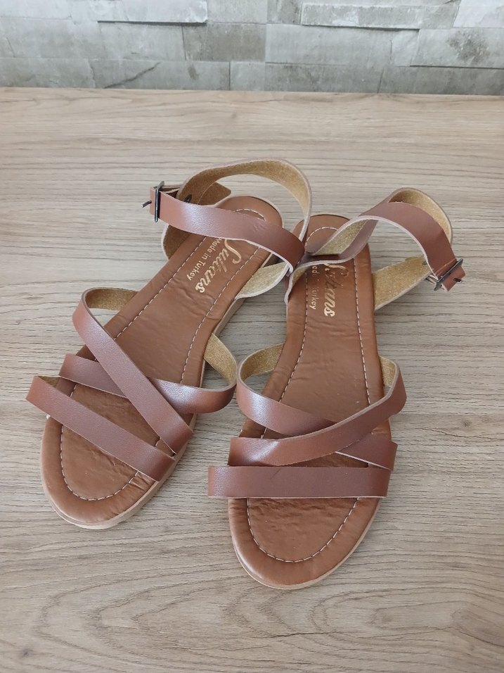 Bej deri kadın sandaletler, dolgu topuklu, çoklu bantlar ve tokalı kapanışa sahiptir. Minimalist ve bohem tarzda günlük kullanım için uygundur.