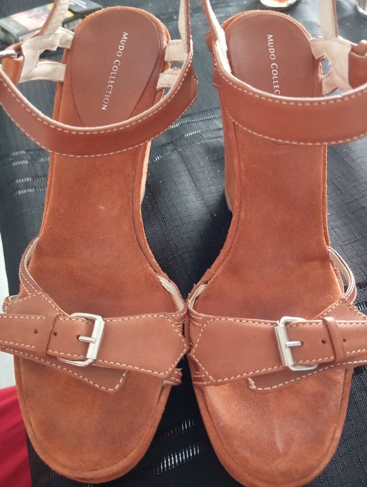 Kahverengi deri dolgu topuklu sandaletler, tokalı kayışı ve parlak görünümü ile minimal ve bohem tarzı yansıtıyor.