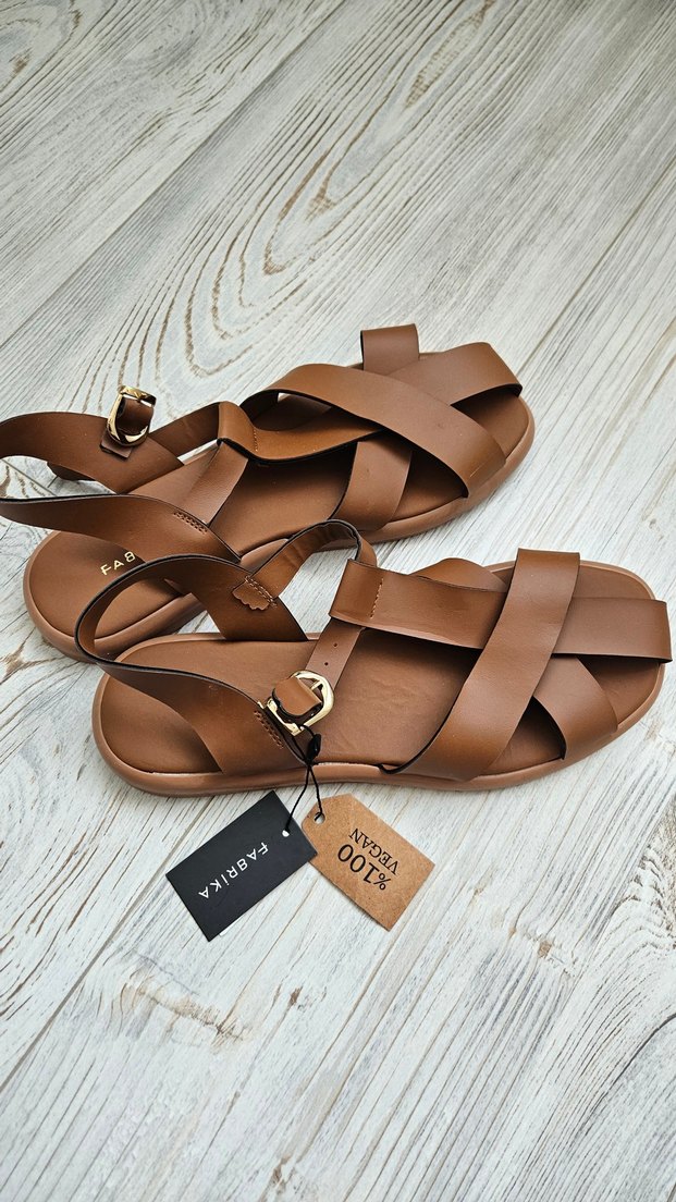 Kahverengi deri, parlak yüzeyli kadın sandalet. Dolgu topuklu ve tokalı kayış detaylarıyla minimalist bohem tarzı sunar. Günlük kullanıma uygundur.