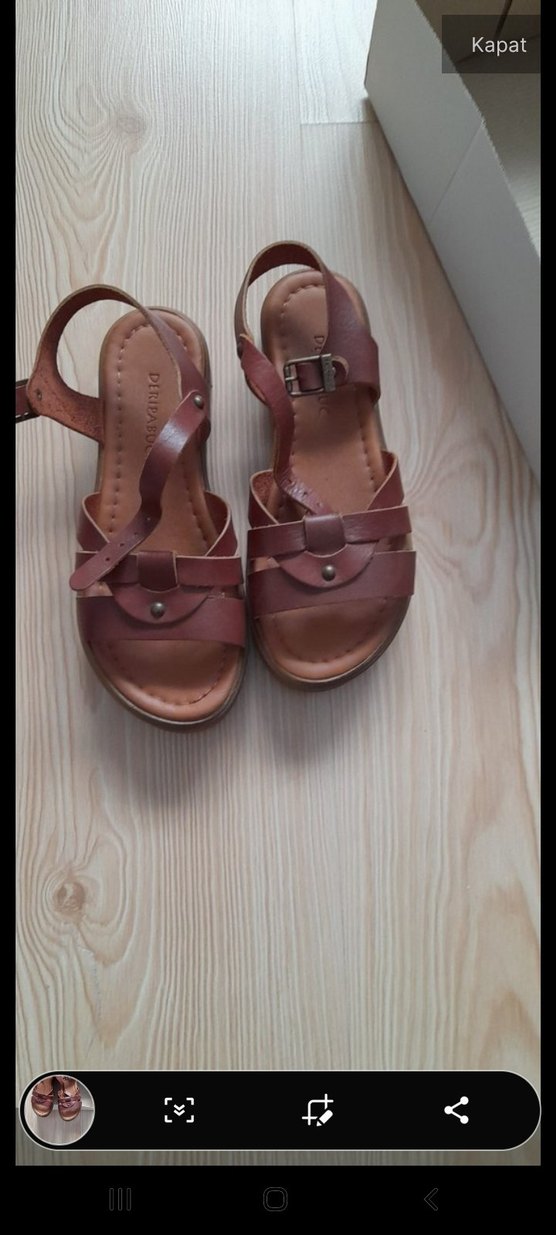 Kahverengi deri kadın sandalet, dolgu topuklu ve tokalı kayışlıdır. Minimalist ve bohem tarzda, günlük kullanıma uygundur. Ayağıma dar geldiği için satıyorum sadece bir kaç defa giydim