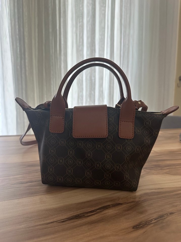 Kahverengi deri kadın el çantası, baskılı desene ve tokalı detaylara sahiptir. Modern klasik tarzı Paris şıklığı ile birleştirir, günlük kullanıma uygundur.