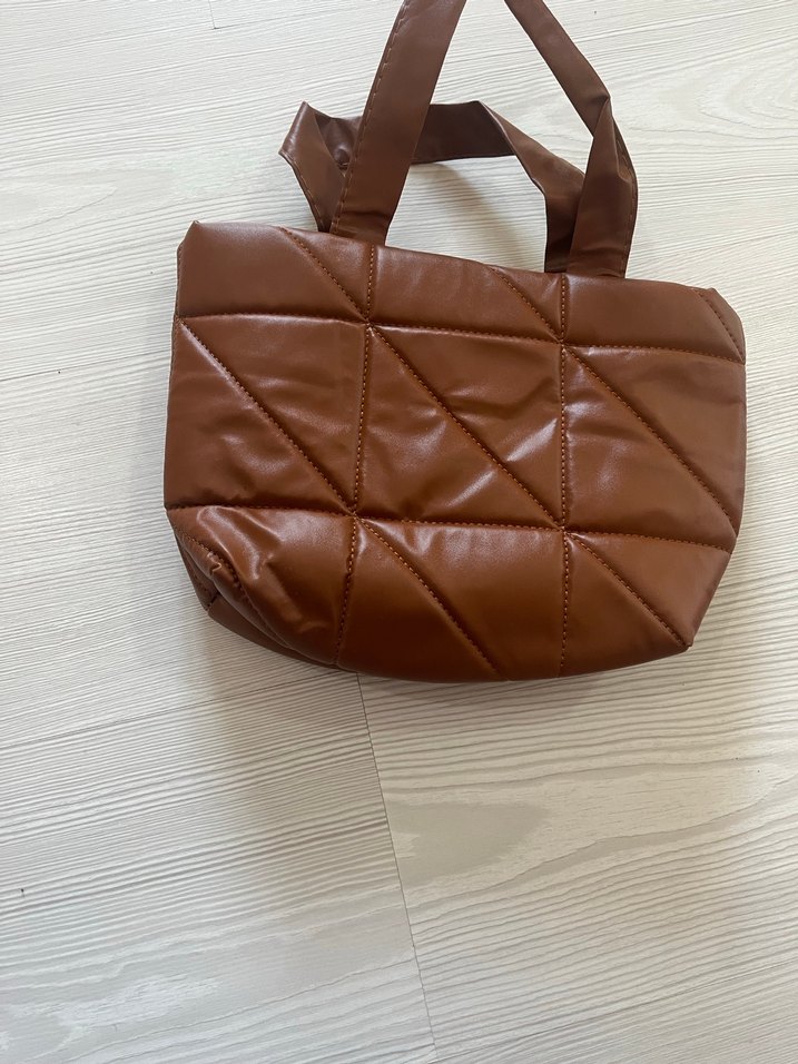 Parlak kahverengi deri kadın el çantası, fermuarlı ve minimalist tarzda günlük kullanım için uygun.