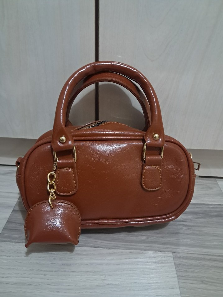 Parlak kahverengi deri, tokalı kadın el çantası. Minimalist ve modern klasik tarzda, günlük kullanım için uygundur.
