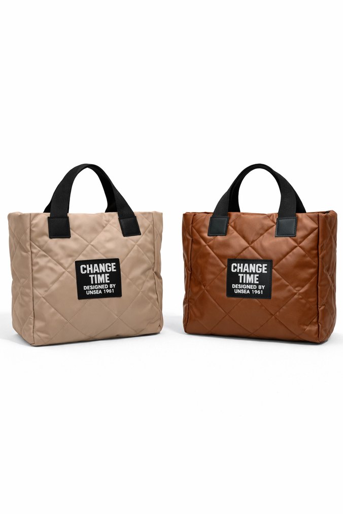 Kahverengi deri el çantası, siyah saplı ve 'CHANGE TIME' baskılı yama ile. Kapitone desene sahip, rahat şık sokak stili sunar.