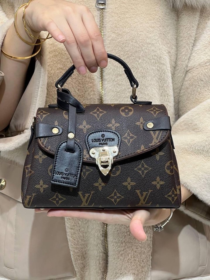 Kahverengi deri, baskılı desene ve tokalı tasarıma sahip kadın el çantası. Modern klasik tarzı ve Paris şıklığını yansıtır, günlük kullanım için uygundur.