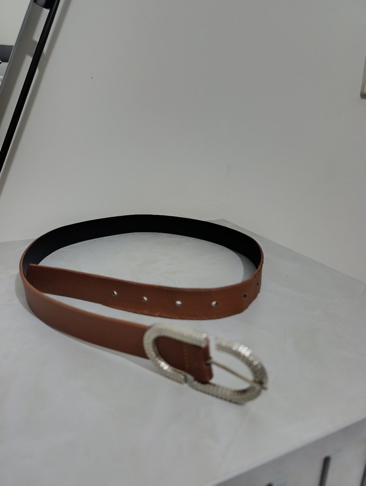 Gümüş tokalı, kahverengi deri kadın kemeri, minimalist deformeler var detaylı resim atabilirim ✅