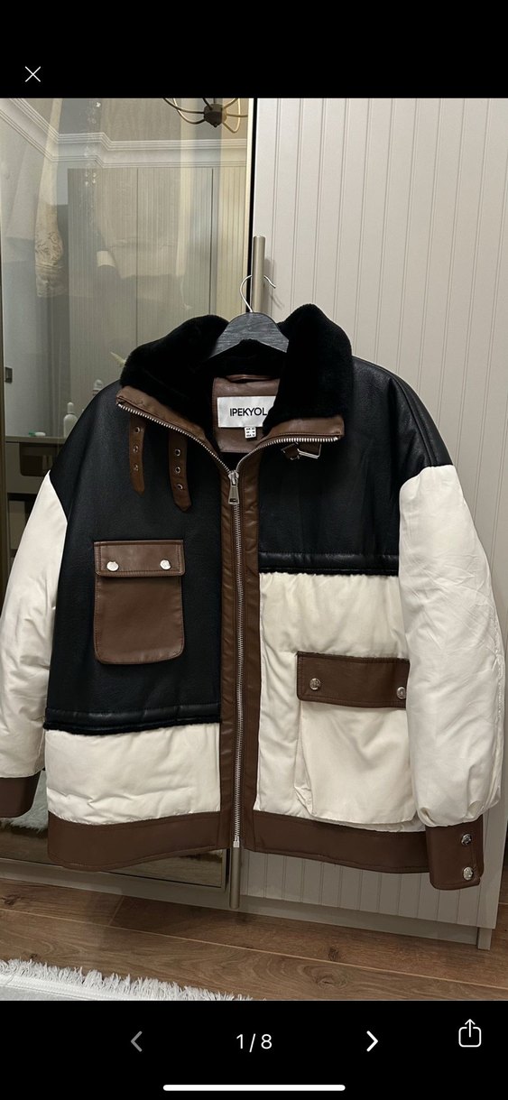 Kadınlar için kahverengi deri kış ceketi, kürklü detaylı ve baskılı desenli. Normal boy, regular fit, kesik yaka ve askılı kollu. Trend sokak stili için ideal.