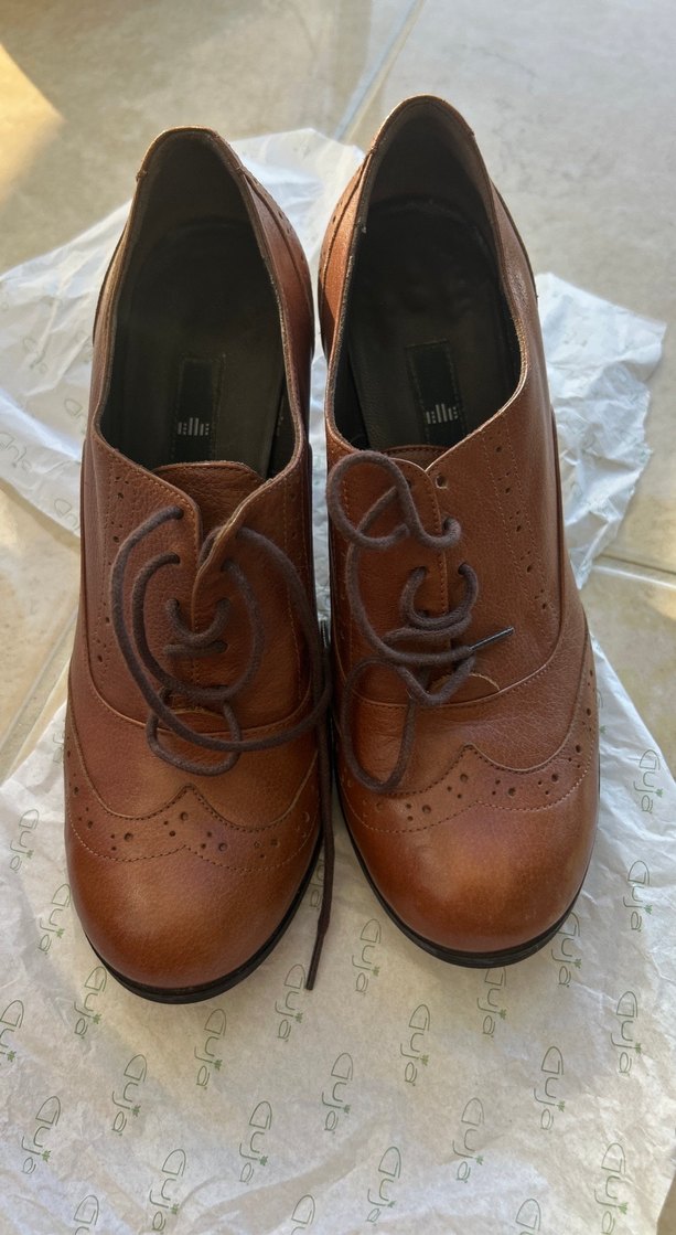 Kahverengi deri, dolgu topuklu, tokalı kadın klasik ayakkabı ofis kullanımı için uygun geleneksel tarzda. Sayılı kullanıldı yeni gibi 38 yazıyo ama kalıbı dar 36-46.5-37