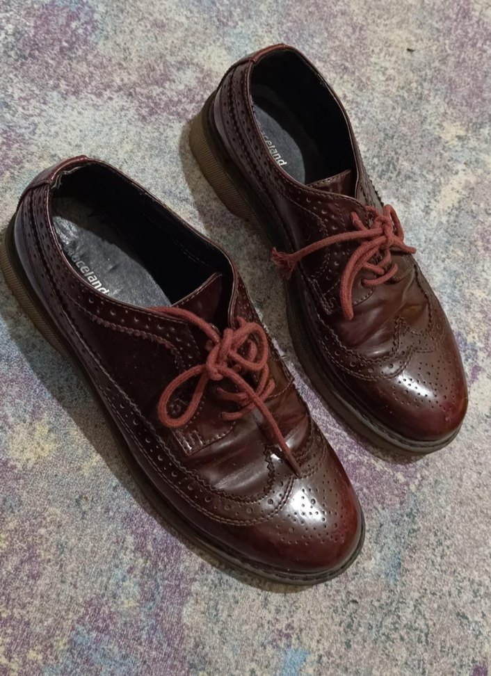 Kahverengi deri kadın klasik ayakkabılar, ofis kullanımı için dolgu topuklu ve düğmeli tasarıma sahiptir. Klasik ve desensiz koyu renklidir.