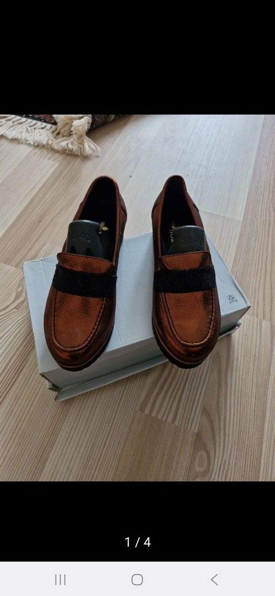 Kahverengi deri kadın loafer, blok topuklu ve kemer detaylı. Günlük kullanıma uygun, trend sokak stiline uyum sağlar.