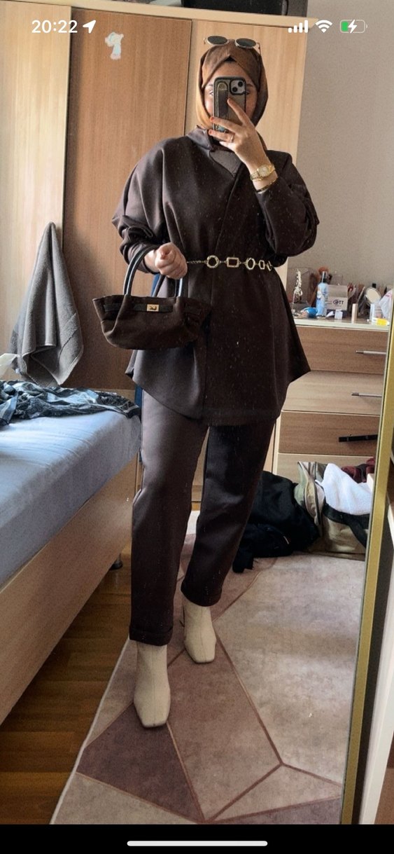 Kahverengi deri kadın takımı, yakalı ve askılı kollu. Midi boy, kemerli ve regular fit kesimle günlük sokak tarzına uygun. Kahverengi takım