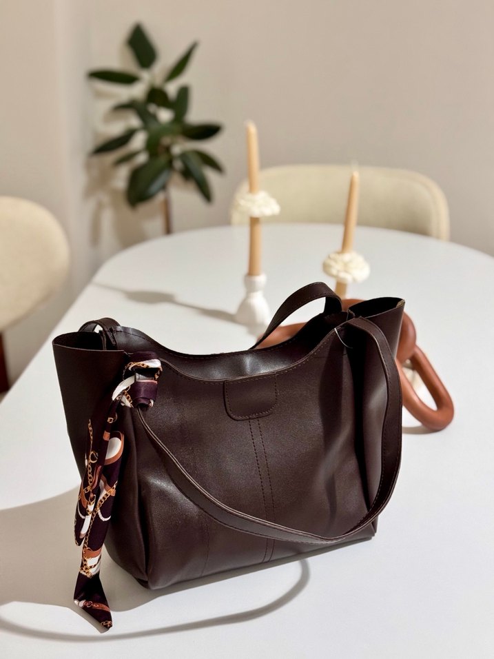 Koyu kahverengi deri kadın çantası, tokalı detay ve şal aksesuarı ile, çağdaş Paris tarzında trendy günlük kullanım için.