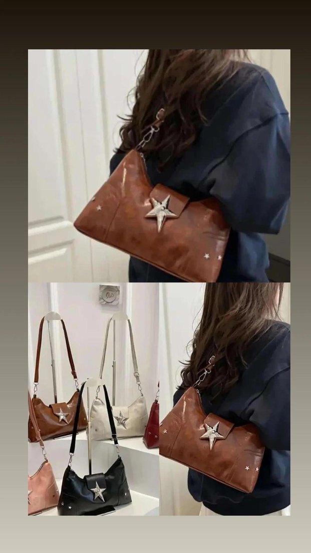 Koyu kahverengi deri kadın omuz çantası, yıldız baskılı ve tokalı detaylı, günlük kullanıma uygun. ⭐mango değildir yurt dışından alindi