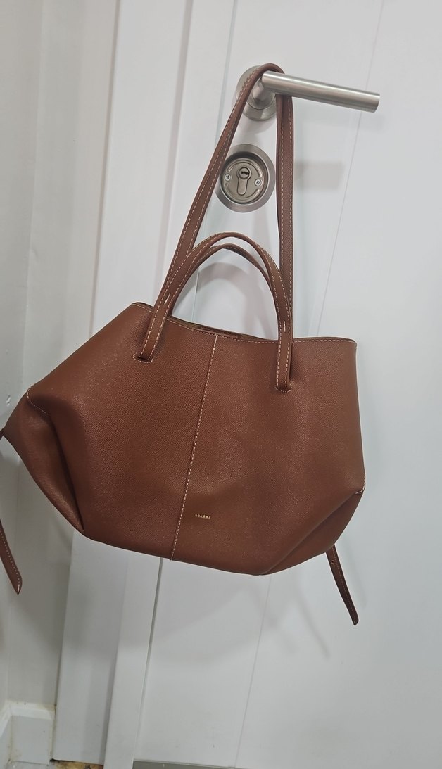 Kahverengi deri, tokalı askılı, parlak yüzeyli, desen içermeyen minimal tasarımlı kadın omuz çantası. Polene markasının benzeri bir çanta fakat orjinal degildir ama kaliteli görünüyor.