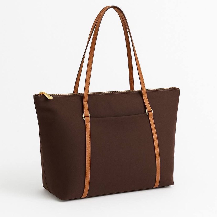 Parlak kahverengi deri kadın çantası, fermuarlı kapama ve ince saplarla minimalist ve çağdaş bir tarz sunar.