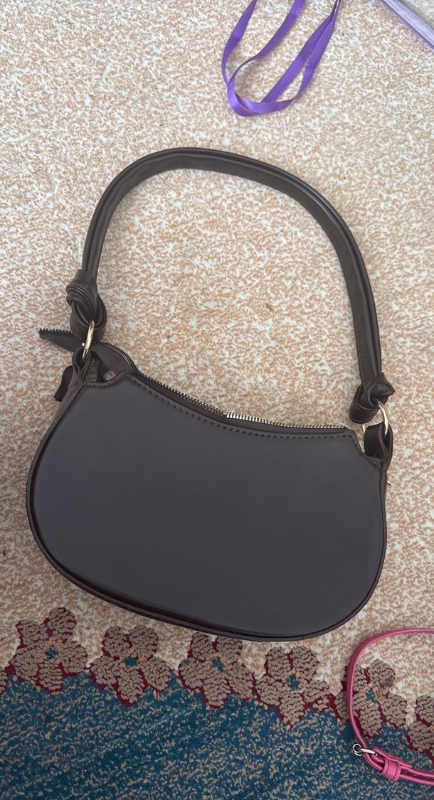 Koyu kahverengi deri, tokalı askılı kadın çantası. Minimalist ve gotik tarzda, günlük kullanıma uygun.
