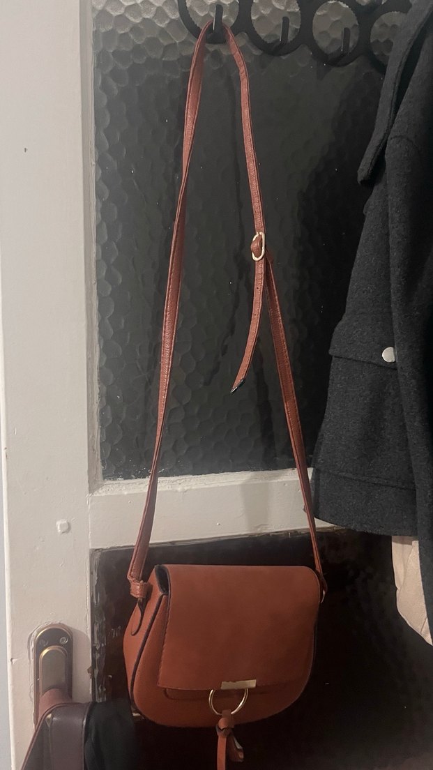 Koyu kahverengi deri omuz çantası, minimal tasarım ve tokalı kayışa sahip. Günlük sokak stili için uygun, trend görünümlerle tamamlanır. Sorunsuzdur