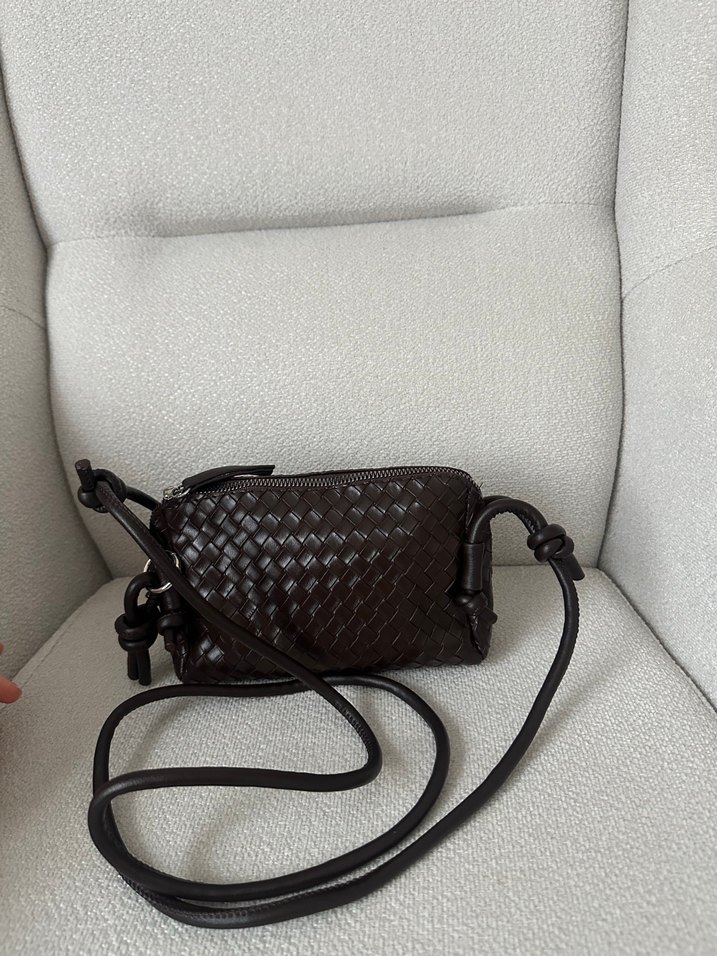 Kahverengi deri, dokuma desenli, ayarlanabilir askılı kadın omuz çantası. Minimalist tasarım, günlük sokak stiline uygun.