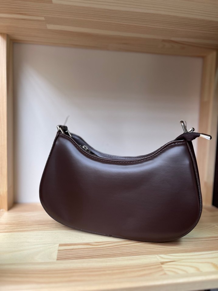Günlük kullanıma uygun, kahverengi deri, minimal ve tokalı kadın omuz çantası. Düz yüzeyli, çağdaş tasarıma sahiptir.