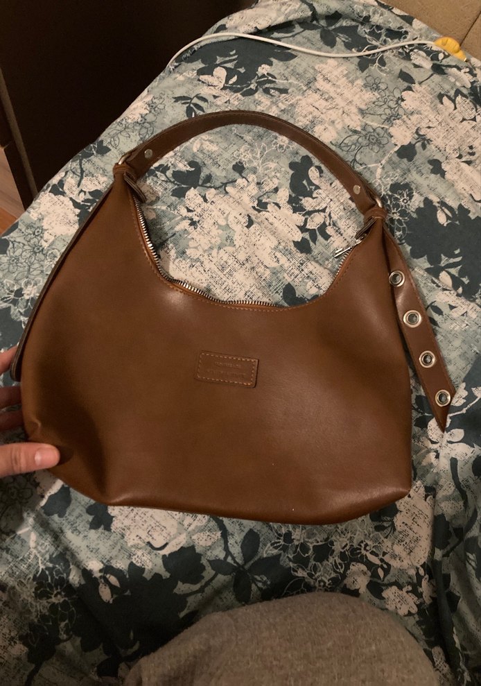 Kahverengi deri, tokalı askıya sahip kadın omuz çantası. Trendy casual sokak stiline uygun, sade tasarımlı günlük kullanıma elverişli.