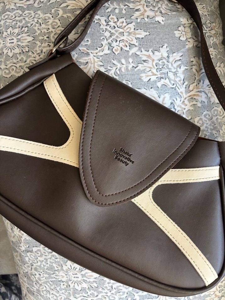 Kahverengi deri omuz çantası, tokalı kapak ve gri baskılı detaylarla klasik zarafeti yansıtıyor.