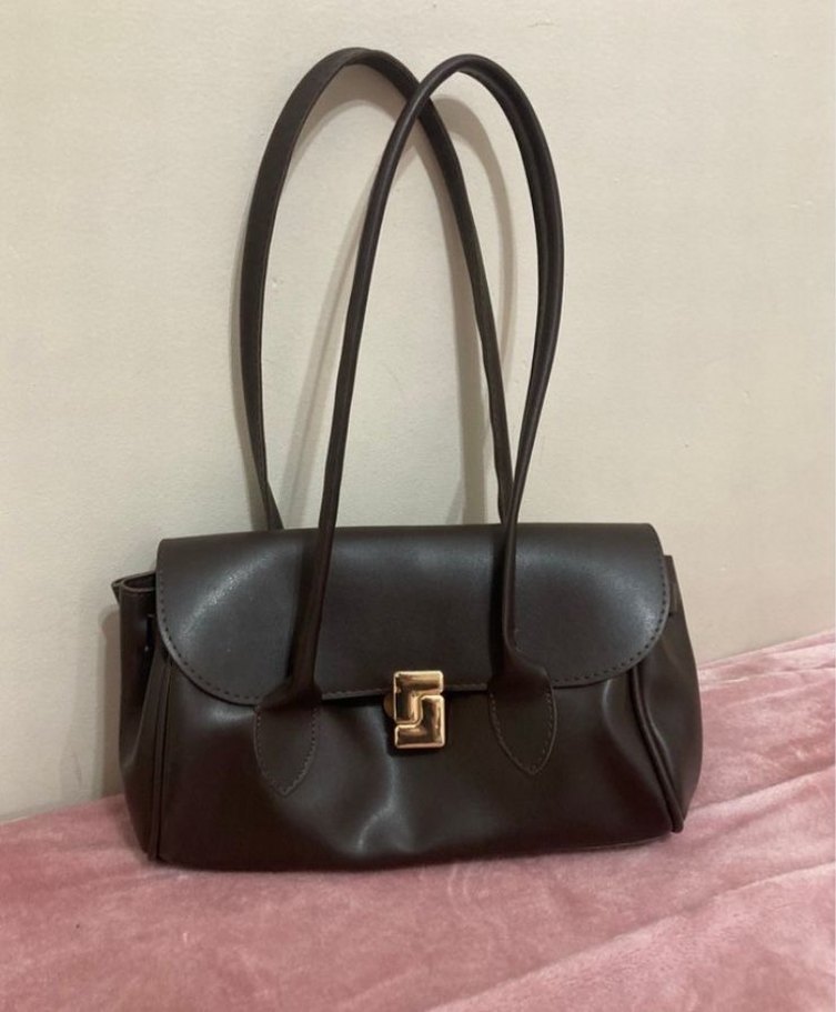 Kahverengi deri, tokalı kapak ve uzun saplı kadın omuz çantası. Minimalist, klasik zarafet ve gotik tarzı yansıtır. Günlük kullanım için uygundur.