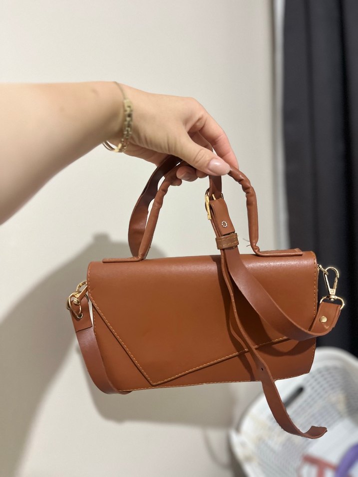 Kahverengi deri kadın çantası, parlak yüzeyli ve tokalı askıya sahiptir. Minimalist, desensiz tasarımı günlük sokak tarzına uygundur.