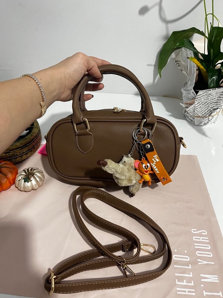 Kahverengi deri, tokalı kadın omuz çantası. Desensiz ve şık, günlük kullanıma uygun Paris sokak stili havasında. Uzun askılıdır
