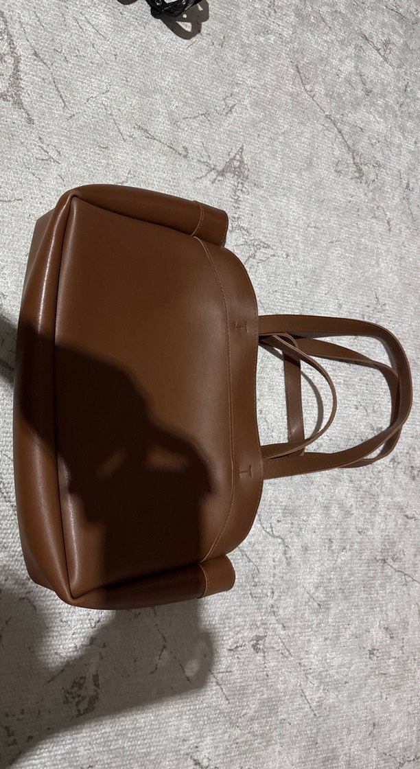 Kahverengi deri, minimalist ve çağdaş tarzda, günlük kullanıma uygun düz yüzeyli kadın omuz çantası.