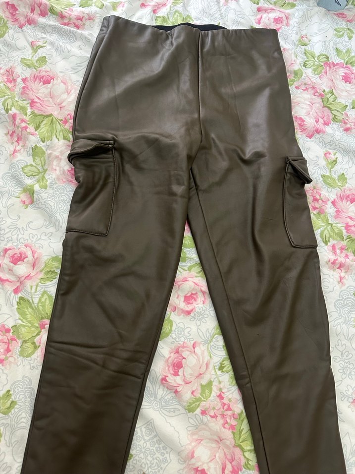 Kahverengi deri, bol kesim ve midi boy kadın pantolon, kemerli ve yan cepli. Günlük sokak stili için uygundur. Temiz bir kusuru yok. Marka temsili