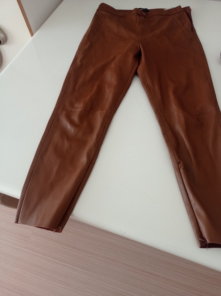 Kahverengi deri, regular fit ve midi boy kadın pantolon. Kemerli bel ve parlak yüzey özellikleriyle günlük rahat sokak stiline uygun.