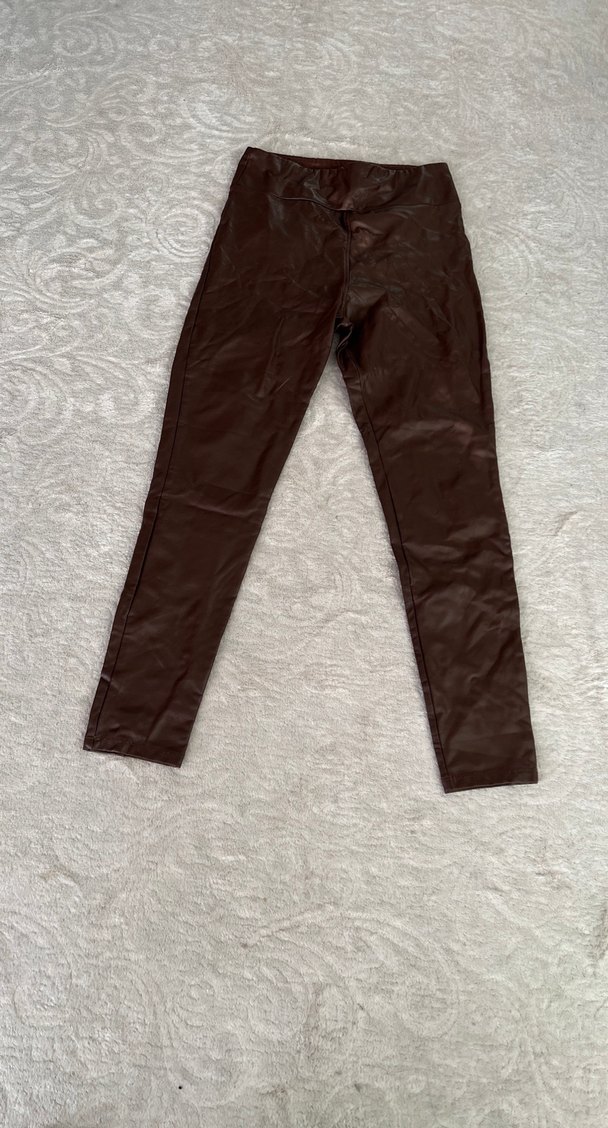 Kahverengi deri, kürklü detaylı, midi boy, normal kesim kadın pantolon. Günlük rahat kullanıma uygun, koyu renk ve desensiz, sokak stili dokunuşu sağlar.