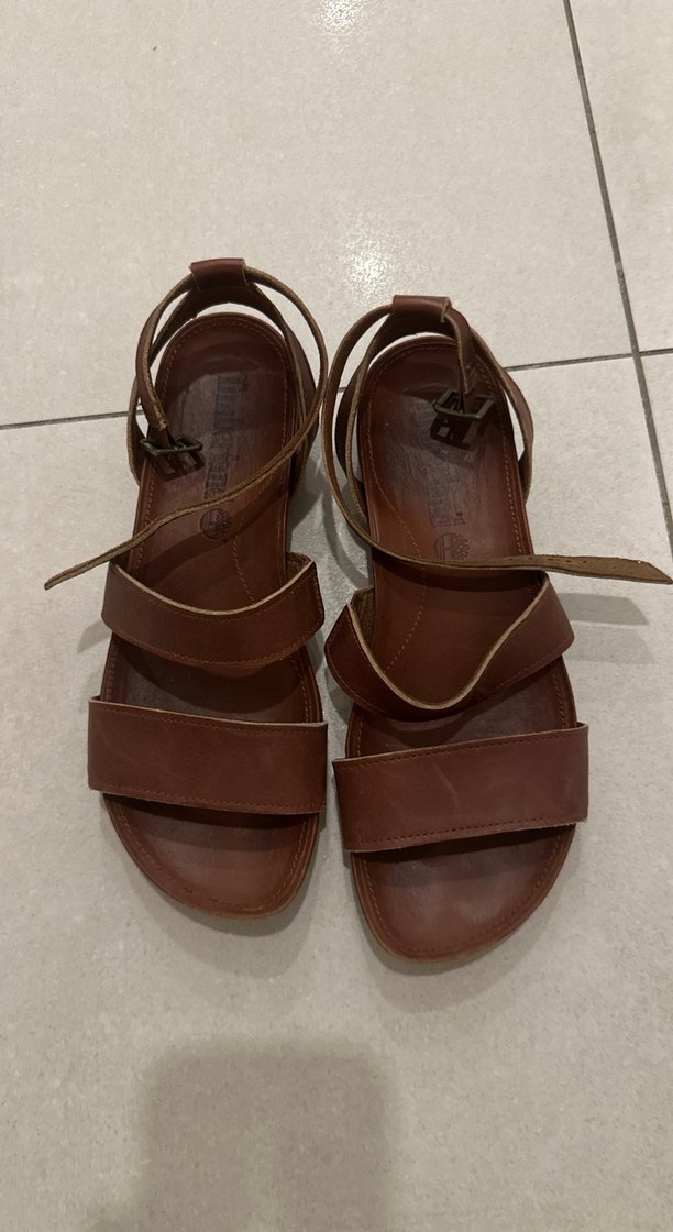 Kahverengi deri kadın sandalet, dolgu topuklu ve tokalı kayışlara sahip. Minimalist ve bohem tarzda, günlük kullanıma uygun.